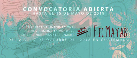 La Coordinadora Latinoamericana de Cine y Comunicación de los Pueblos Indígenas (CLACPI) abre convocatoria para participar en el 13º Festival Internacional de Cine y Comunicación de los Pueblos Indígenas / Originarios -FICMAYAB’- que se celebrará del 2 al 17 de octubre 2018 en Guatemala y tendrá como sedes principales Totonicapán, Quetzaltenango, la ciudad de Guatemala, Cobán y Chisec en Alta Verapaz, con actividades complementarias durante los meses previos en el territorio mesoamericano (El Salvador, Honduras, Nicaragua, Costa Rica, Panamá, México y Guatemala).