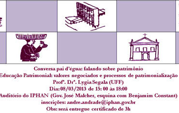 O Instituto do Patrimônio Histórico e Artístico Nacional no Pará (IPHAN-PA) promove o 3º evento do ciclo de palestras Conversa Pai D’égua: falando sobre patrimônio, no próximo dia 8 de março, no auditório do IPHAN à Avenida Governador José Malcher, nº 474, em Belém