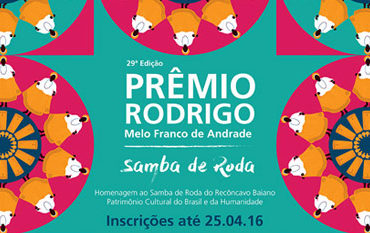 Já está aberto, até o dia 25 de abril de 2016, o processo de inscrição para a 29ª edição do Prêmio Rodrigo Melo Franco de Andrade, promovido pelo Instituto do Patrimônio Histórico e Artístico Nacional. O edital é voltado ao reconhecimento e à promoção de ações de preservação do patrimônio e que tenham relevância pública.