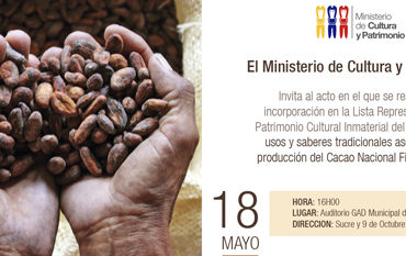 El Ministerio de Cultura y Patrimonio realizará la incorporación en la Lista Representativa de Patrimonio Cultural Inmaterial del Ecuador a los USOS Y SABERES TRADICIONALES ASOCIADOS A LA PRODUCCION DE CACAO NACIONAL FINO DE AROMA, como un reconocimiento simbólico dirigido principalmente a los portadores de estos saberes, traducidos en prácticas, usos sociales y culturales de varias poblaciones ecuatorianas.