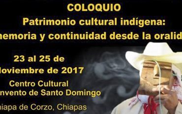 Del 23 al 25 de noviembre de 2017, en Chiapa de Corzo, Chiapas, se realizará el Coloquio Patrimonio cultural indígena: memoria y continuidad desde la oralidad, organizado por la Secretaria de Cultura, el Gobierno del Estado de Chiapas a través del Consejo Estatal para las Culturas y las Artes de Chiapas y del Centro Estatal de Lenguas, Arte y Literatura Indígenas (CELALI).
