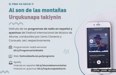 El Festival Internacional de Música de Alturas (FIMA) llega a diferentes lugares del Perú, a través de los programas de radio en español y quechua: Al son de las montañas y Urqukunapa Takiynin. Este es un proyecto beneficiario de las Líneas de Apoyo Económico para la Cultura 2020 del Ministerio de Cultura de Perú.