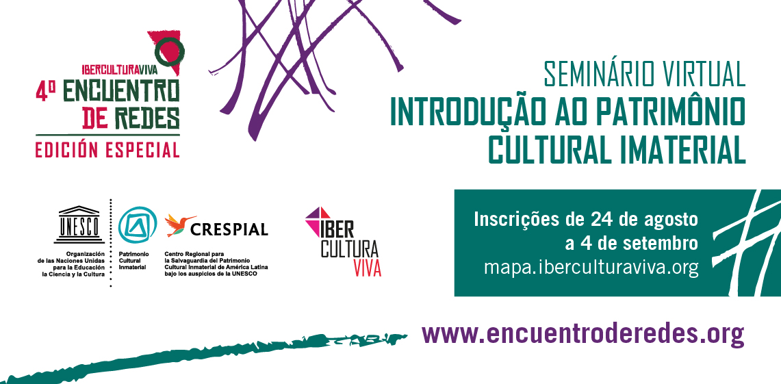 De 16 de setembro a 14 de outubro, durante o 4º Encontro de Redes IberCultura Viva – Edição Especial, será realizado o seminário virtual “Introdução ao Patrimônio Cultural Imaterial”, organizado pelo Centro Regional para a Salvaguarda do Patrimônio Cultural Imaterial da América Latina (CRESPIAL) em colaboração com o programa.
