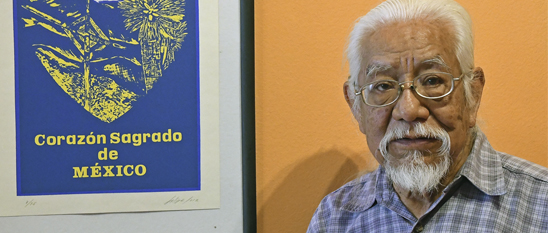 Se trata de más de 40 piezas, entre serigrafía, punta seca, xilografía y linóleo, además de arte objeto hechos con chaquira y estambre, así como textos, que se adentran en la cosmovisión del pueblo wixárika o huichol.