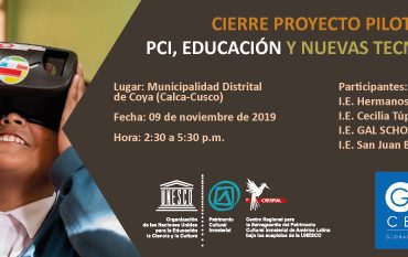 El sábado 9 de noviembre, en la Municipalidad Distrital de Coya en la Provincia de Calca, Cusco, se realizará la clausura del proyecto piloto: Patrimonio cultural inmaterial (PCI), educación y nuevas tecnologías. El evento se desarrollará de 2.30 p.m