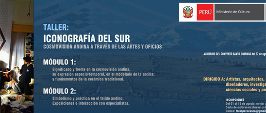 Un interesante ciclo de Talleres sobre Iconografía Andina en cerámica y tejidos se llevarán a cabo del 27 de agosto al 01 de setiembre, organizado por la Dirección Desconcentrada de Cultura de Cusco, mediante la Subdirección de Interculturalidad.