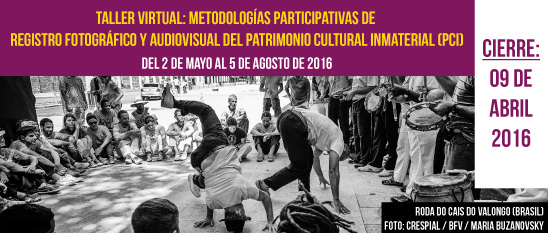 El Centro Regional para la Salvaguardia del Patrimonio Cultural Inmaterial de América Latina (CRESPIAL), convoca al Taller virtual: Metodologías participativas de Registro fotográfico y audiovisual del patrimonio cultural inmaterial (PCI), el cual se desarrollará del 2 de mayo al 5 de agosto de 2016.