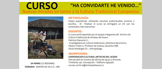 Los participantes del curso conocerán algunas de las expresiones de la cultura tradicional campesina, asociadas al ciclo agrario de las regiones del Bio Bío y el Maule. Comprender el sentido de las expresiones de la cultura tradicional como parte de la cosmovisión campesina. Destacar los componentes éticos, culturales y ecológicos de las expresiones tradicionales campesinas. Analizar críticamente las relaciones existentes entre cultura tradicional campesina y patrimonio cultural.