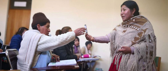 “La lengua sin la cultura no es lengua, y la cultura sin la lengua no es cultura”, dice Sonia Siñani, la profesora, que viste una amplia pollera, una mantilla clara y un sombrero al estilo tradicional de las cholas paceñas.