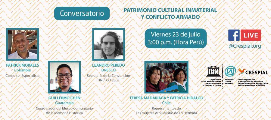 El CRESPIAL realizará el Conversatorio virtual: «Patrimonio Cultural Inmaterial y Conflicto Armado» el próximo 23 de julio de 2021 a las 3:00 p.m. (Hora de Perú). El desarrollo del evento plantea conocer las experiencias comunitarias sobre memoria del conflicto, así como también la relación entre el patrimonio cultural inmaterial y los conflictos armados. Y proponer la importancia de que los países miembro del CRESPIAL cuenten con un documento que detalle la relación entre el patrimonio cultural inmaterial y los conflictos armados.