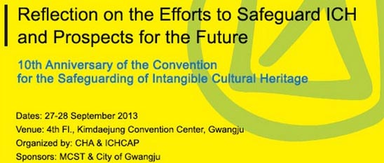 Del 27 al 29 de septiembre de 2013, en la ciudad de Gwangju, República de Corea, se realizó la Conferencia Internacional sobre la ejecución de las tareas Convención 2003: Reflexiones en torno a los esfuerzos para salvaguardar el patrimonio cultural inmaterial y perspectivas para el futuro.