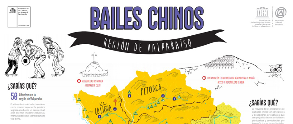 Por medio de esta infografía, la Subdirección Nacional de Patrimonio Cultural Inmaterial, del Servicio Nacional de Patrimonio Cultural, invita a conocer más sobre la tradición y organización territorial de los bailes chinos en la región de Valparaíso.