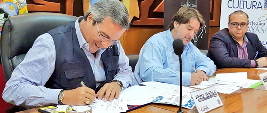 El Director Ejecutivo del Instituto Nacional de Patrimonio Cultural (INPC), Joaquín Moscoso, y el Prefecto del Guayas, Jimmy Jairala, firmaron en Guayaquil, la mañana de este jueves 12 de octubre, un convenio interinstitucional que compromete a las dos entidades a trabajar en conjunto para posibilitar que el Rodeo Montuvio sea incluido en la Lista Representativa Patrimonio Cultural Inmaterial de la Nación.