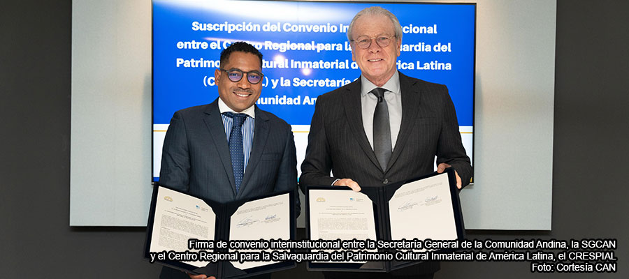 La Secretaría General de la Comunidad Andina, la SGCAN y el Centro Regional para la Salvaguardia del Patrimonio Cultural Inmaterial de América Latina, el CRESPIAL han firmado un convenio interinstitucional que representa un hito importante para la salvaguarda y la difusión del patrimonio cultural vivo de la región Andina y de los Estados Miembros.