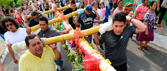 Los pobladores del municipio de San Juan Nonualco en La Paz, celebran el Día de la Cruz con el tradicional recorrido de las Palancas, en la que cargan una cruz de aproximadamente cuatro metros de largo, decoradas con diversos frutos que son llevados por los seis barrios que componen el municipio.