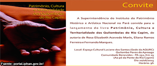 \r\n Resultado de projeto que buscou evidenciar a relação do Engenho Aproaga com as comunidades quilombolas estabelecidas em seu entorno, a publicação Patrimônio, Cultura e Territorialidade dos Quilombolas do Rio Capim, de autoria de Rosa Elizabeth Acevedo Marin, Eliana Ramos Ferreira e Fernando Luiz Tavares Marques, será lançado no próximo dia 20 de junho, sede da Associação Quilombola Unidos do Rio Capim (AQURC), localizado na comunidade quilombola Benevides, município de São Domingos do Capim, no Pará.