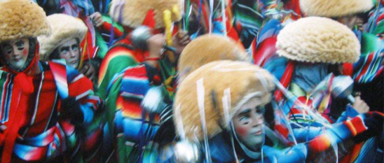 “La celebración inicia el 8 de enero con el recorrido de los Chuntá -hombres vestidos y maquillados como mujeres, con faldas y blusas bordadas-, que eran la servidumbre de doña María de Angulo y repartían la comida en el tiempo de la sequía”, refirió también en la entrevista Paulino Nangullasmú Alegría, portador y mascarero de esta tradición.