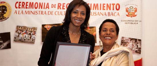 La Mesa de Trabajo AfroPeruana del Congreso de la República rindió homenaje a la ministra de Cultura, Susana Baca, por ser la primera mujer afroperuana que ocupa el cargo como titular en un Ministerio de Estado se informó a través de la página web del Ministerio de Cultura de Perú.