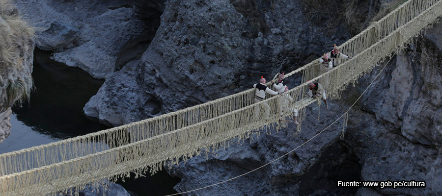 El puente Q’eswachaka se renueva cada año, durante la segunda semana de junio, mediante la mink’a (trabajo comunal) con la participación de las familias de las comunidades de Huinchiri, Chaupibanda, Choccayhua, y Ccollana Quehue, en la provincia de Canas en Cusco, ubicado sobre un tramo del río Apurímac.