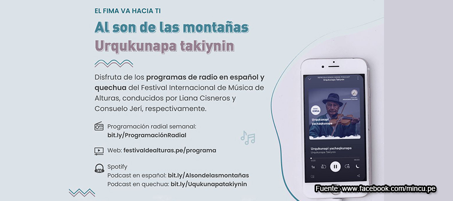El Festival Internacional de Música de Alturas (FIMA) llega a diferentes lugares del Perú, a través de los programas de radio en español y quechua: Al son de las montañas y Urqukunapa Takiynin. Este es un proyecto beneficiario de las Líneas de Apoyo Económico para la Cultura 2020 del Ministerio de Cultura de Perú.