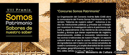 El convenio Andrés Bello invita todas las instituciones públicas y privadas y miembros de la sociedad civil, que trabajan por incentivar la investigación sobre el patrimonio culinario y tengan experiencia en registro, sistematización, análisis e innovación relacionados con las cocinas tradicionales de la región, a participar en la convocatoria del Premio “Somos Patrimonio”.